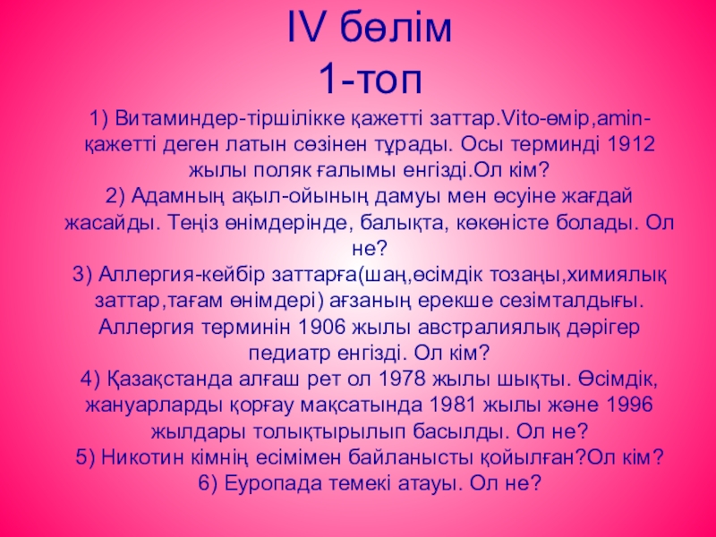 3) Аллергия-кейбір заттарға(шаң,өсімдік тозаңы,химиялық заттар,тағам өнімдері) ағзаның ерекше сезімталдығы. Аллергия терминін 1906 жылы австралиялық дәрігер педиатр енгізді. Ол кім?