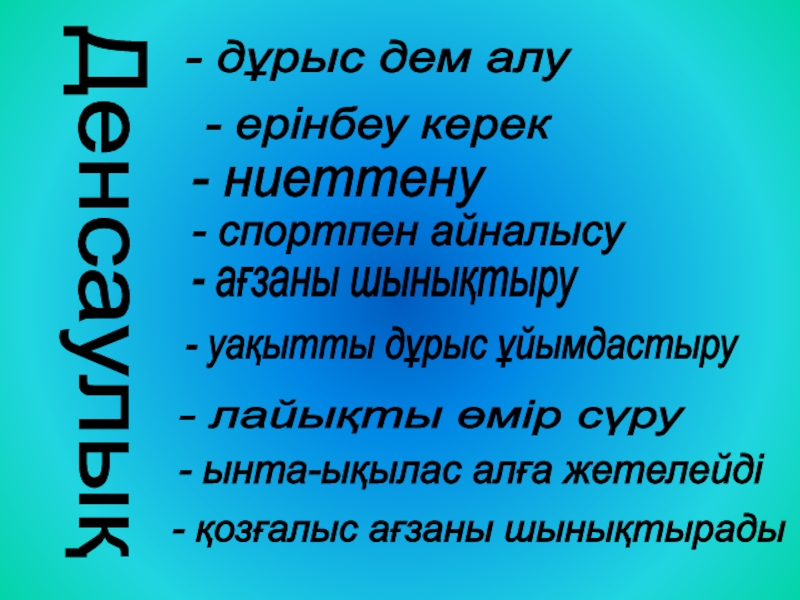 Слайд 2Мақсаты: Білімділік – оқушылардың салауатты өмір салты жайлы білімдерін тереңдету,оларды