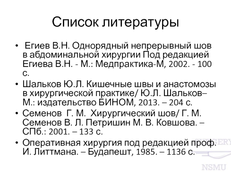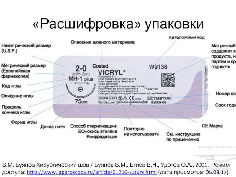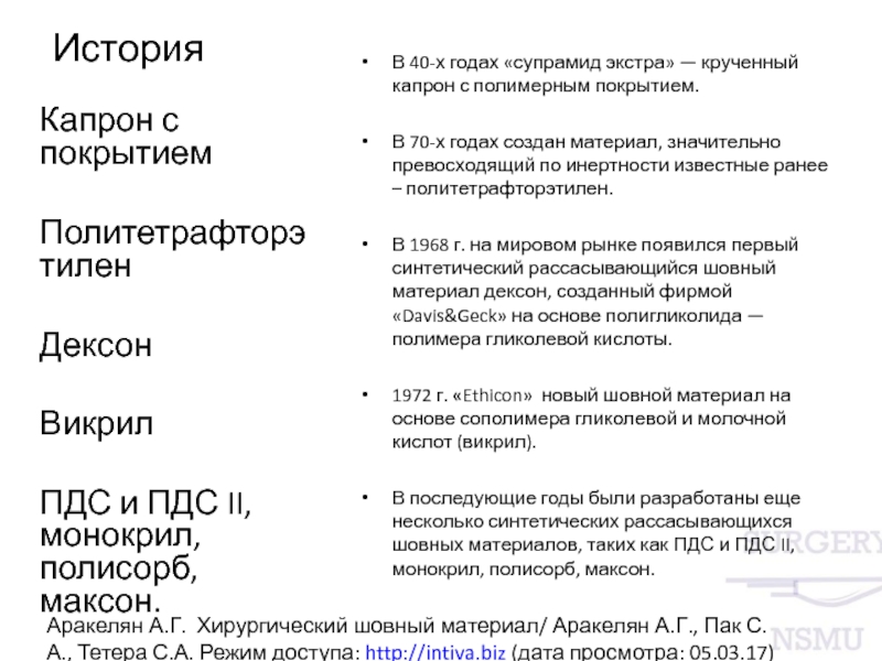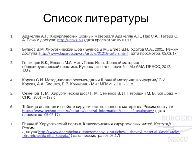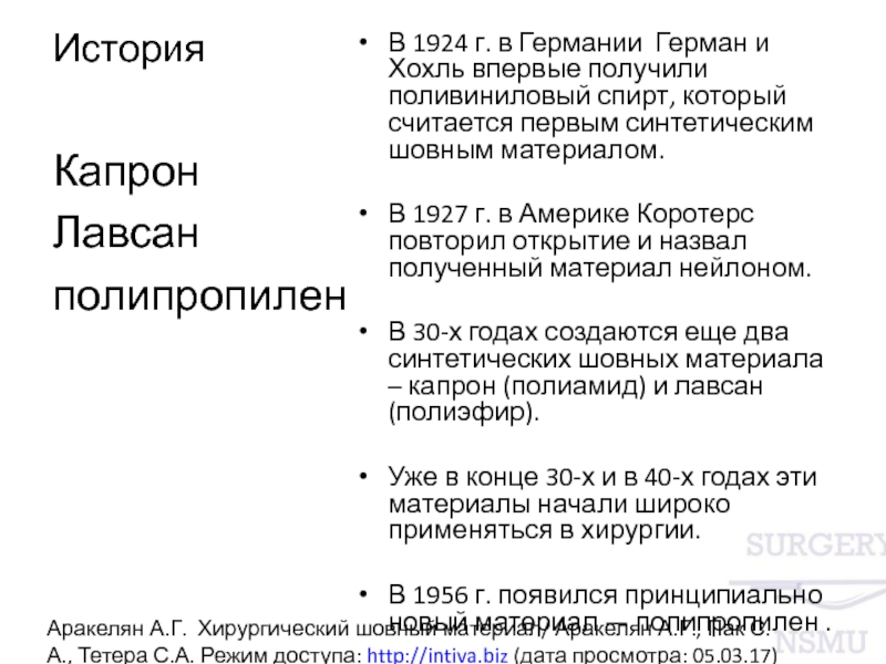 Аракелян А.Г. Хирургический шовный материал/ Аракелян А.Г., Пак С.А., Тетера С.А. Режим доступа: http://intiva.biz (дата просмотра: 05.03.17)