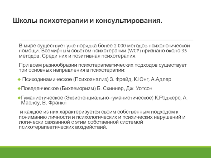 методов психологической помощи. Всемирным советом психотерапии (WCP) признано около 35
