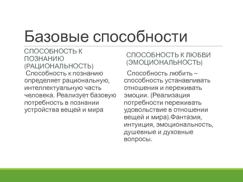 Способность любить – способность устанавливать отношения и переживать эмоции. (Реализация потребности переживать удовольствие в отношении вещей и мира).Фантазия, интуиция, эмоциональность, душевные и духовные вопросы.