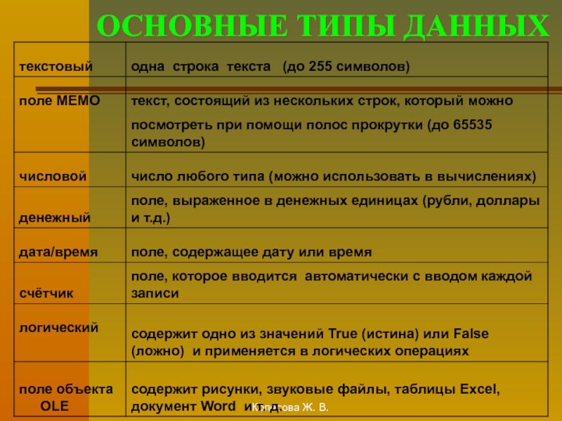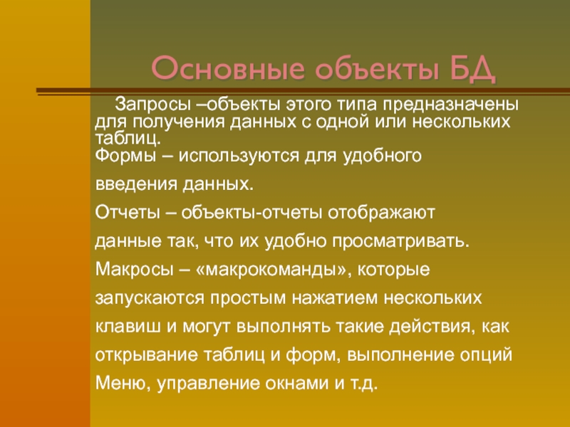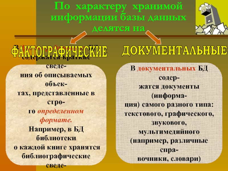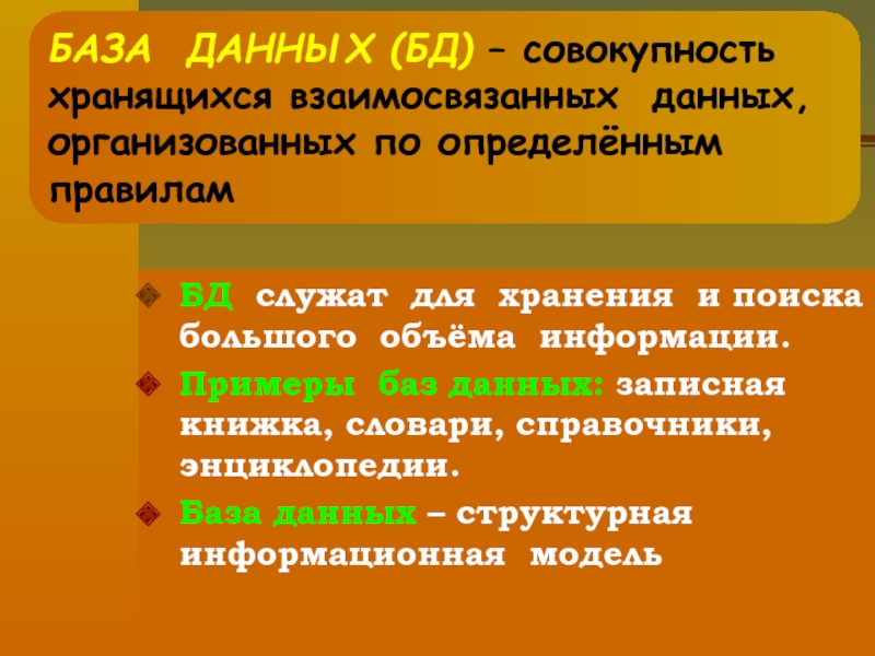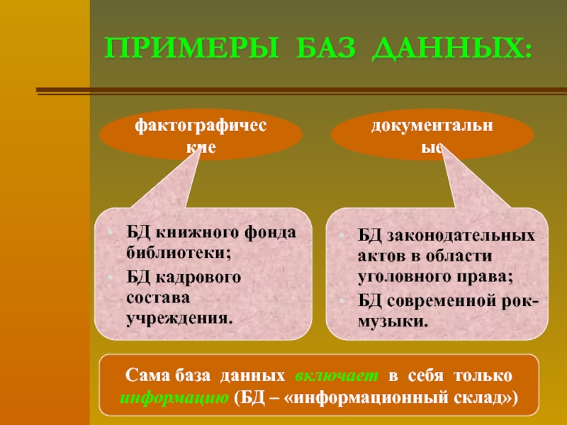 Примеры баз данных: записная книжка, словари, справочники, энциклопедии.