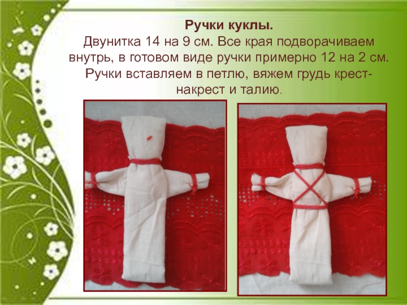Ручки куклы. Двунитка 14 на 9 см. Все края подворачиваем внутрь, в готовом виде ручки примерно 12