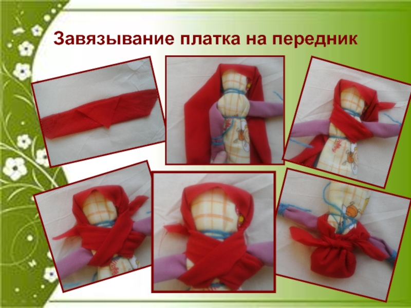 Повязываем кукле пояс. Сверху красный платок. Платок можно одеть под передник, можно сверху передника