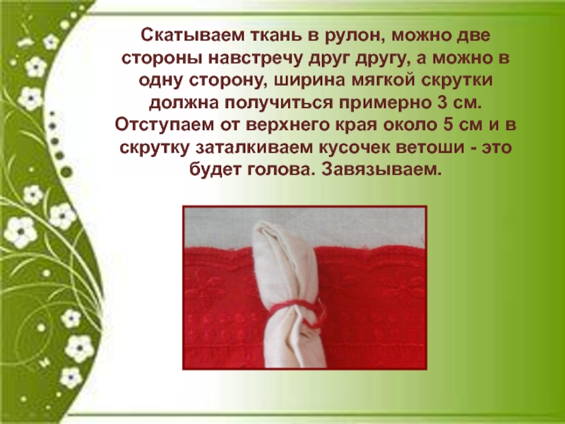Слайд 4Скатываем ткань в рулон, можно две стороны навстречу друг другу,