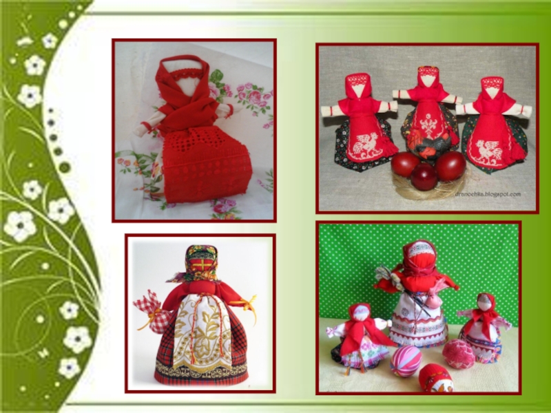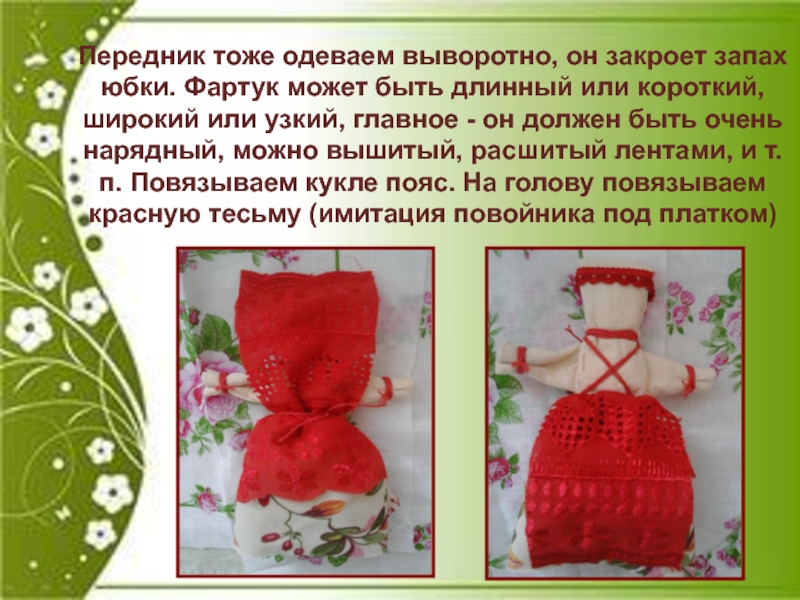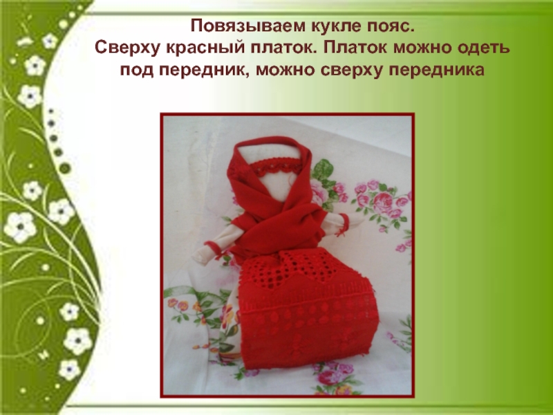 должен быть очень нарядный, можно вышитый, расшитый лентами, и т.п. Повязываем кукле пояс. На голову повязываем красную тесьму (имитация повойника под платком)