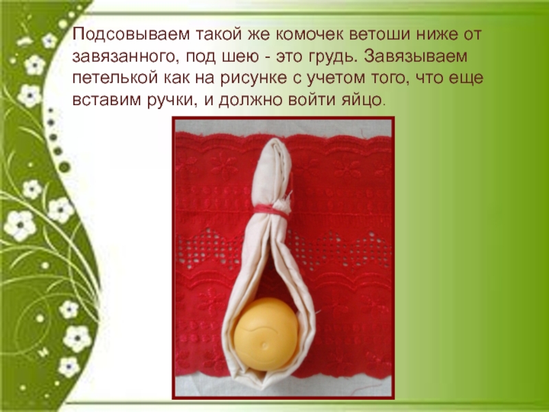 Слайд 5Подсовываем такой же комочек ветоши ниже от завязанного, под шею