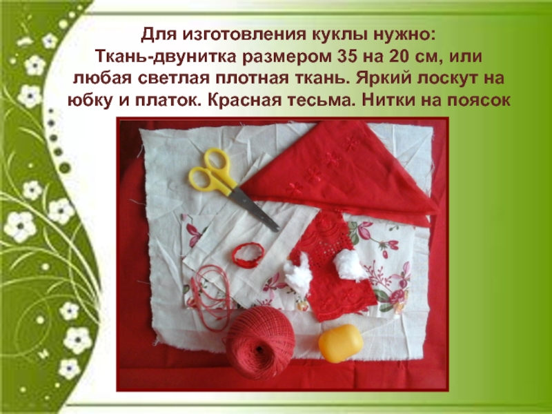 Для изготовления куклы нужно:Ткань-двунитка размером 35 на 20 см, или любая светлая плотная ткань. Яркий лоскут на
