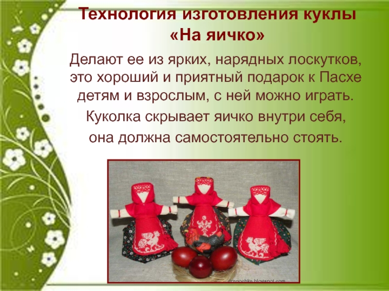 Технология изготовления куклы «На яичко» Делают ее из ярких, нарядных лоскутков, это хороший и приятный подарок к Пасхе детям и взрослым, с ней можно играть.Куколка скрывает яичко внутри себя,она должна самостоятельно