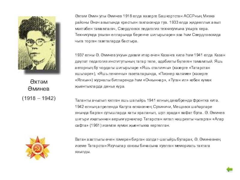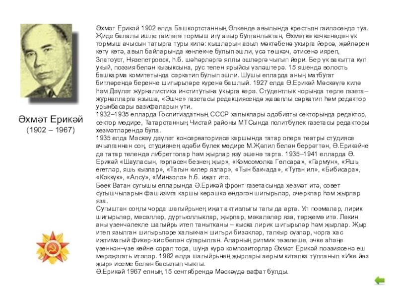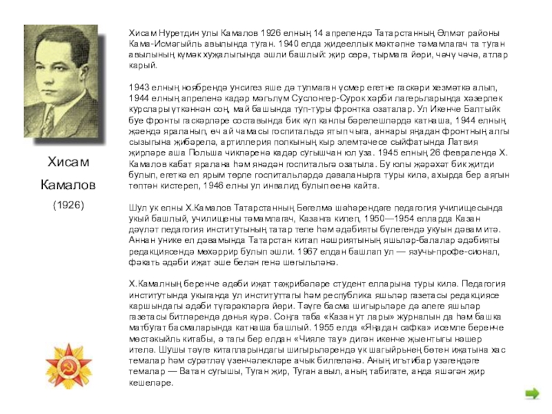 — очерклары, документаль повестьлары билгели. Аның яраткан темасы — Бөек