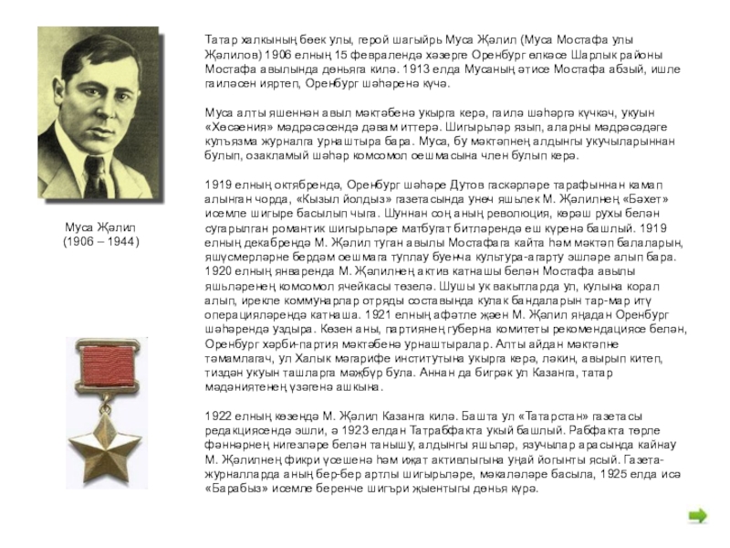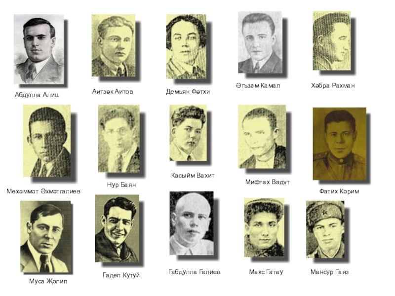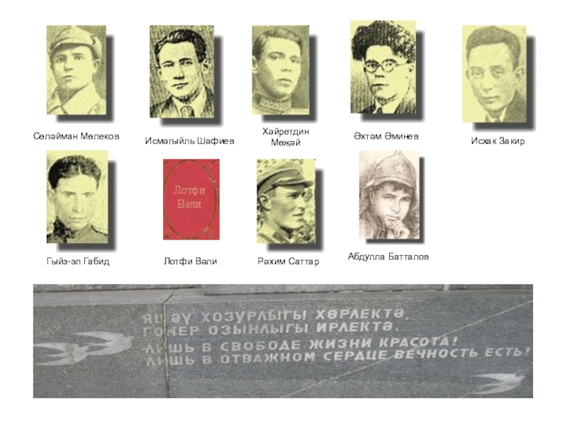 М.Җәлил. “Тупчы анты”; М.Хөсәен. “Туган ил өчен”);