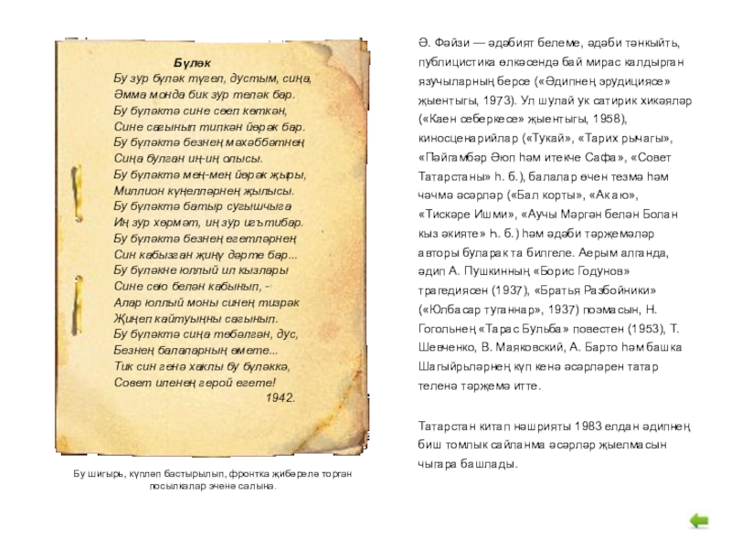 Бу шигырь, күпләп бастырылып, фронтка җибәрелә торган посылкалар эченә салына.