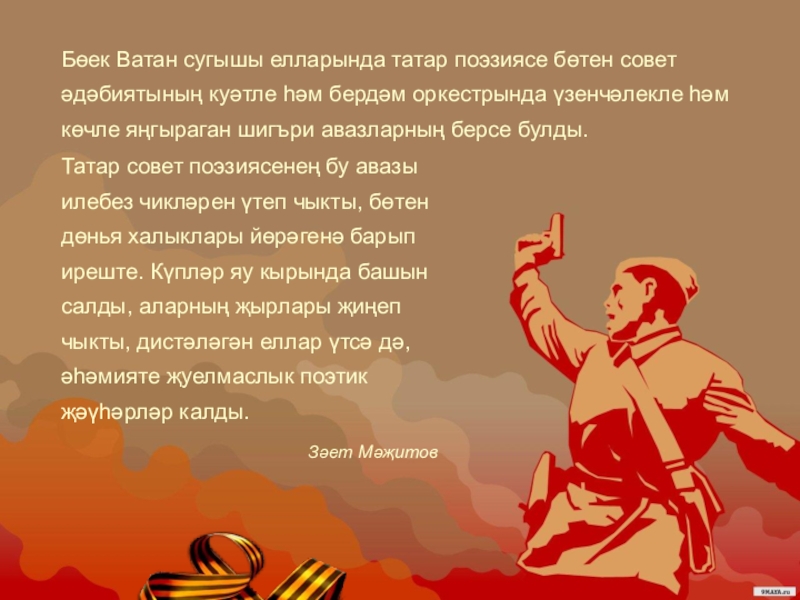Слайд 6Бөек Ватан сугышы елларында татар поэзиясе бөтен совет әдәбиятының куәтле