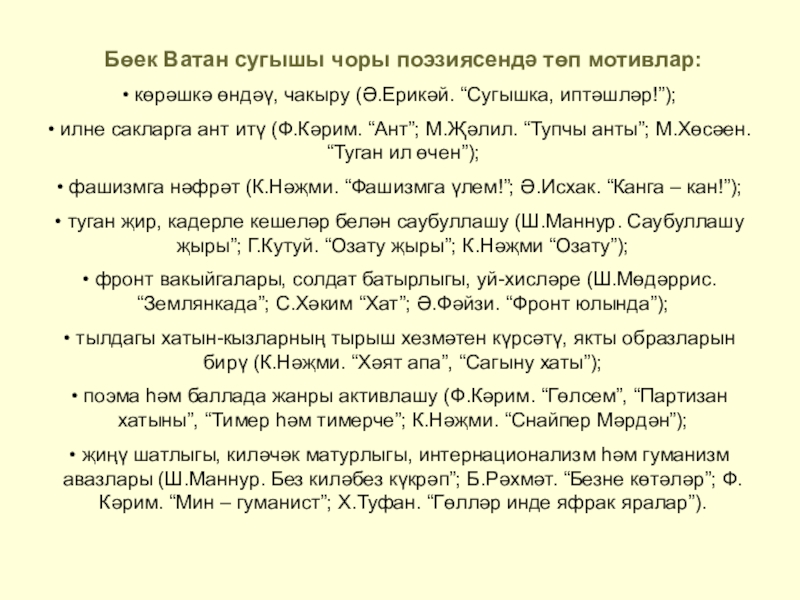 Слайд 7Бөек Ватан сугышы чоры поэзиясендә төп мотивлар: