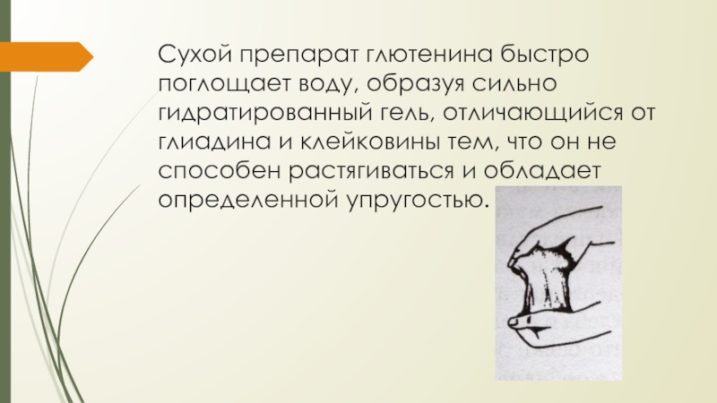 Слайд 13Сухой препарат глютенина быстро поглощает воду, образуя сильно гидратированный гель,