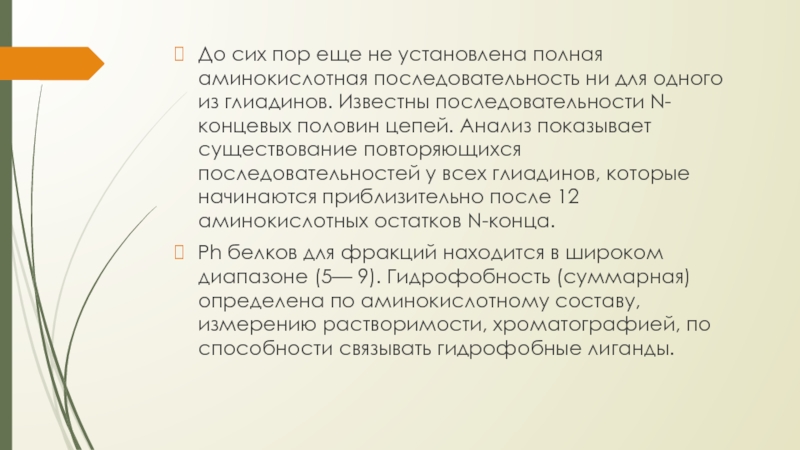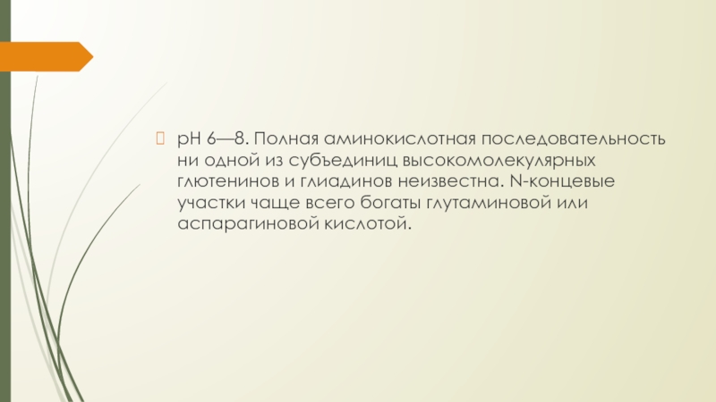 рН 6—8. Полная аминокислотная последовательность ни одной из субъединиц высокомолекулярных глютенинов и глиадинов неизвестна. N-концевые участки чаще