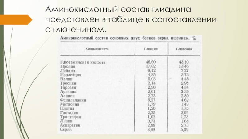 Слайд 15Аминокислотный состав глиадина представлен в таблице в сопоставлении с глютенином.