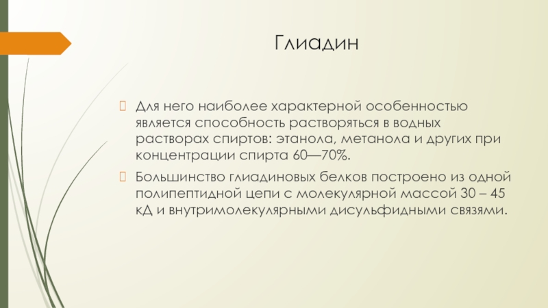 ГлиадинДля него наиболее характерной особенностью является способность растворяться в водных растворах спиртов: этанола, метанола и других при