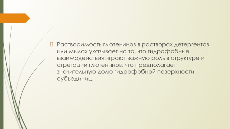 Слайд 12Растворимость глютенинов в растворах детергентов или мылах указывает на то,