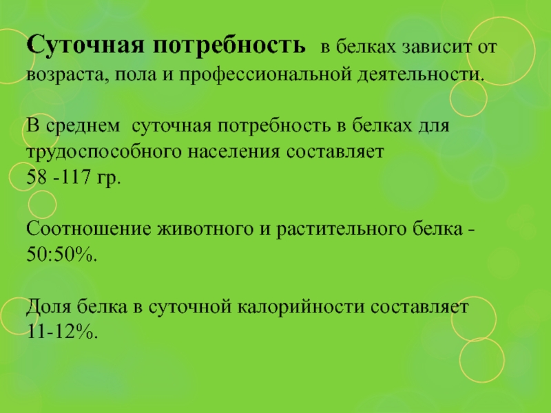 Слайд 7Суточная потребность в белках зависит от возраста, пола и профессиональной