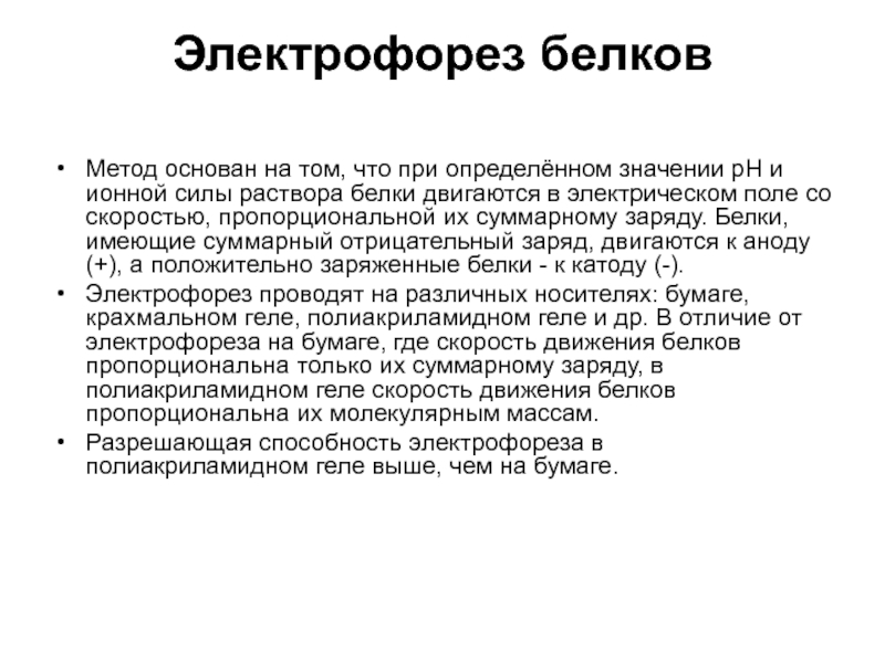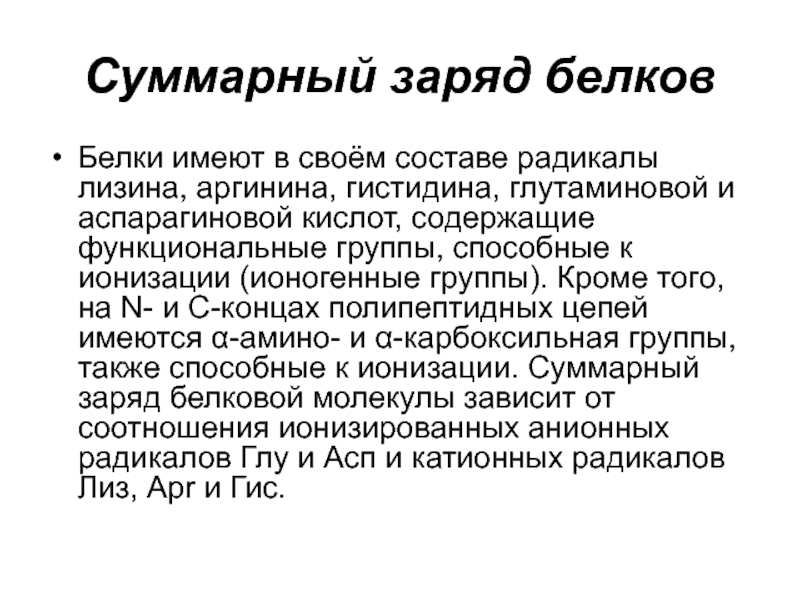 к ионизации (ионогенные группы). Кроме того, на N- и С-концах полипептидных цепей имеются α-амино- и α-карбоксильная группы, также способные к ионизации. Суммарный заряд белковой молекулы зависит от соотношения ионизированных анионных радикалов Глу и Асп и катионных радикалов Лиз, Apr и Гис.