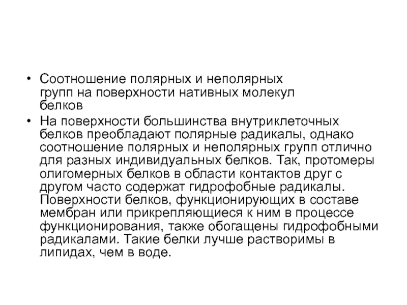 групп отлично для разных индивидуальных белков. Так, протомеры олигомерных белков в области контактов друг с другом часто содержат гидрофобные радикалы. Поверхности белков, функционирующих в составе мембран или прикрепляющиеся к ним в процессе функционирования, также обогащены гидрофобными радикалами. Такие белки лучше растворимы в липидах, чем в воде.
