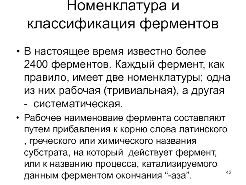 Рабочее наименоваие фермента составляют путем прибавления к корню слова латинского , греческого или химического названия субстрата, на который действует фермент, или к названию процесса, катализируемого данным ферментом окончания “-аза”.