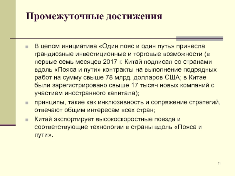 г. Китай подписал со странами вдоль «Пояса и пути» контракты на выполнение подрядных работ на сумму свыше 78 млрд. долларов США; в Китае были зарегистрировано свыше 17 тысяч новых компаний с участием иностранного капитала);