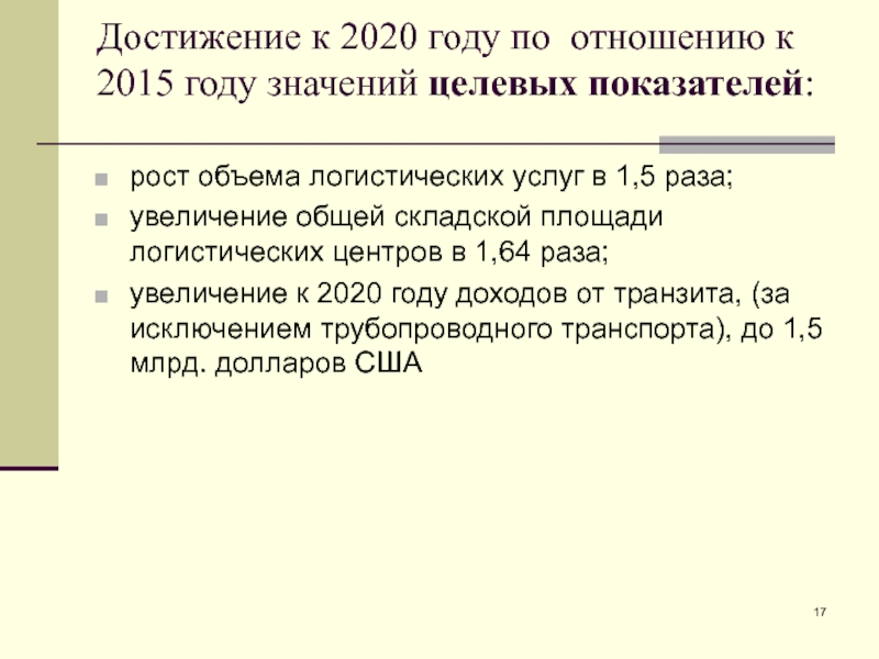 увеличение к 2020 году доходов от транзита, (за исключением трубопроводного транспорта), до 1,5 млрд. долларов США
