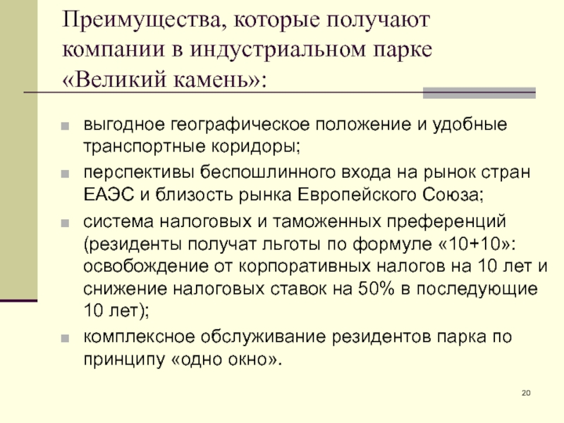 Слайд 20Преимущества, которые получают компании в индустриальном парке «Великий камень»: