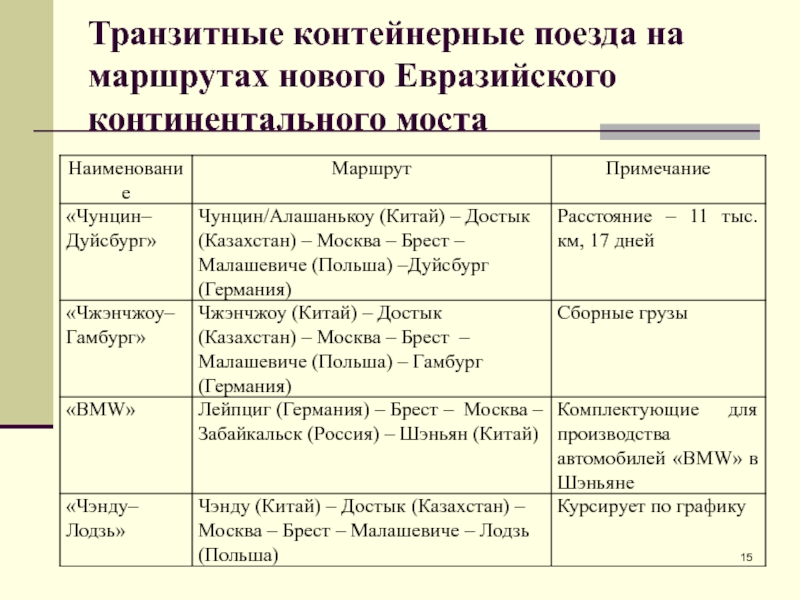 Слайд 15Транзитные контейнерные поезда на маршрутах нового Евразийского континентального моста