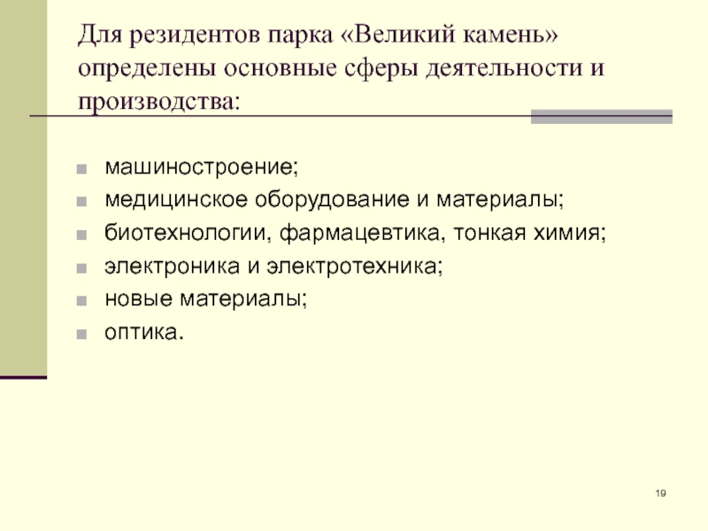 Слайд 19Для резидентов парка «Великий камень» определены основные сферы деятельности и