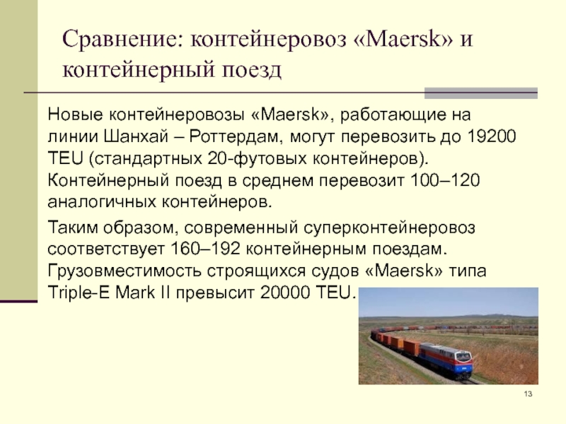 Слайд 13Сравнение: контейнеровоз «Maersk» и контейнерный поезд
