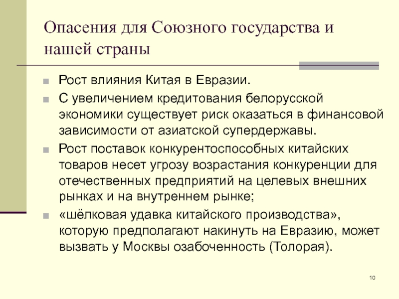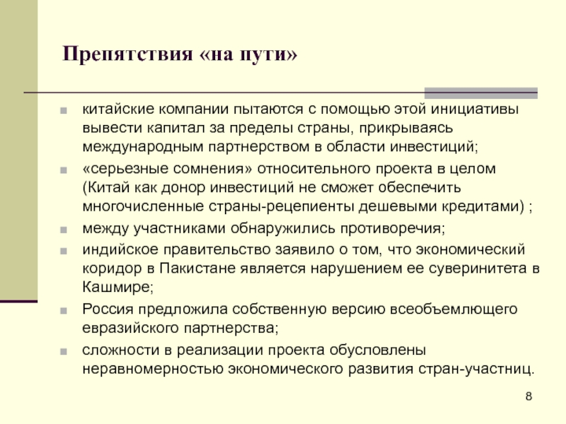 сомнения» относительного проекта в целом (Китай как донор инвестиций не сможет обеспечить многочисленные страны-рецепиенты дешевыми кредитами) ;
