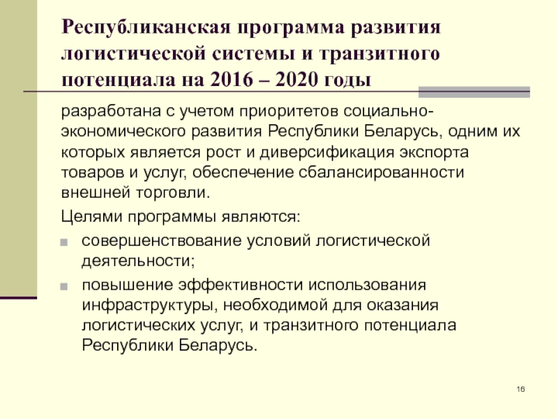 Слайд 16Республиканская программа развития логистической системы и транзитного потенциала на 2016