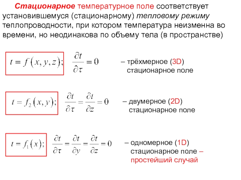 Стационарное температурное поле соответствует установившемуся (стационарному) тепловому режиму теплопроводности, при котором температура неизменна во времени, но неодинакова по объему тела (в пространстве)