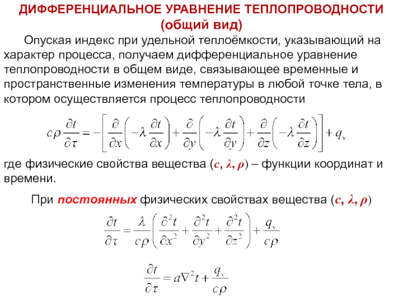при удельной теплоёмкости, указывающий на характер процесса, получаем дифференциальное уравнение теплопроводности в общем виде, связывающее временные и пространственные изменения температуры в любой точке тела, в котором осуществляется процесс теплопроводности
