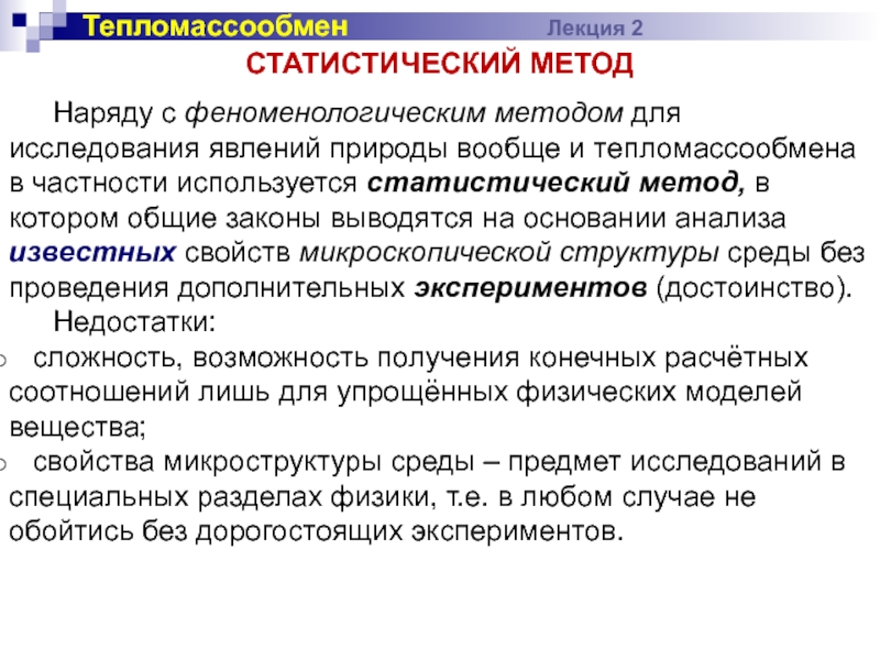 явлений природы вообще и тепломассообмена в частности используется статистический метод,