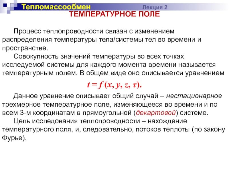 во всех точках исследуемой системы для каждого момента времени называется температурным полем. В общем виде оно описывается уравнением