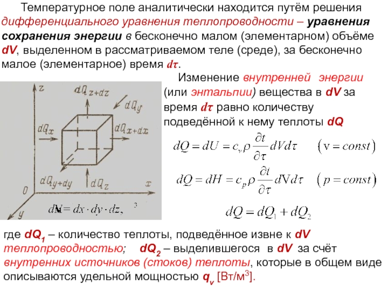 где dQ1 – количество теплоты, подведённое извне к dV теплопроводностью; dQ2 – выделившегося в dV за счёт внутренних источников (стоков) теплоты, которые в общем виде описываются удельной мощностью qv [Вт/м3].
