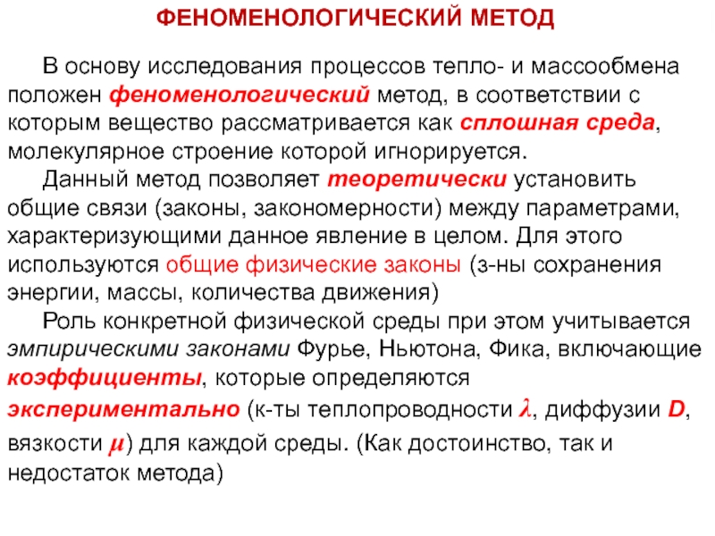 Роль конкретной физической среды при этом учитывается эмпирическими законами Фурье, Ньютона, Фика, включающие коэффициенты, которые определяются экспериментально (к-ты теплопроводности λ, диффузии D,