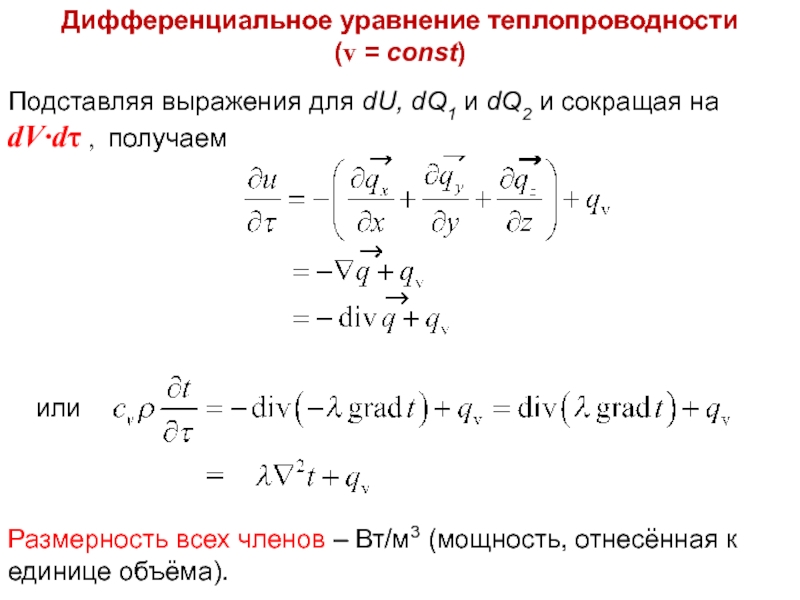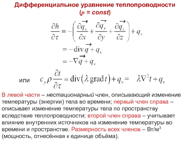 тела по пространству вследствие теплопроводности; второй член справа – учитывает влияние внутренних источников на изменение температуры во времени и пространстве. Размерность всех членов – Вт/м3 (мощность, отнесённая к единице объёма).