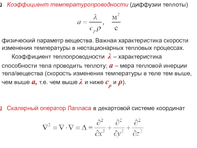 Коэффициент теплопроводности λ – характеристика способности тела проводить теплоту; а – мера тепловой инерции тела/вещества (скорость изменения температуры в теле тем выше, чем выше а, т.е. чем выше λ и ниже ср и ρ).
