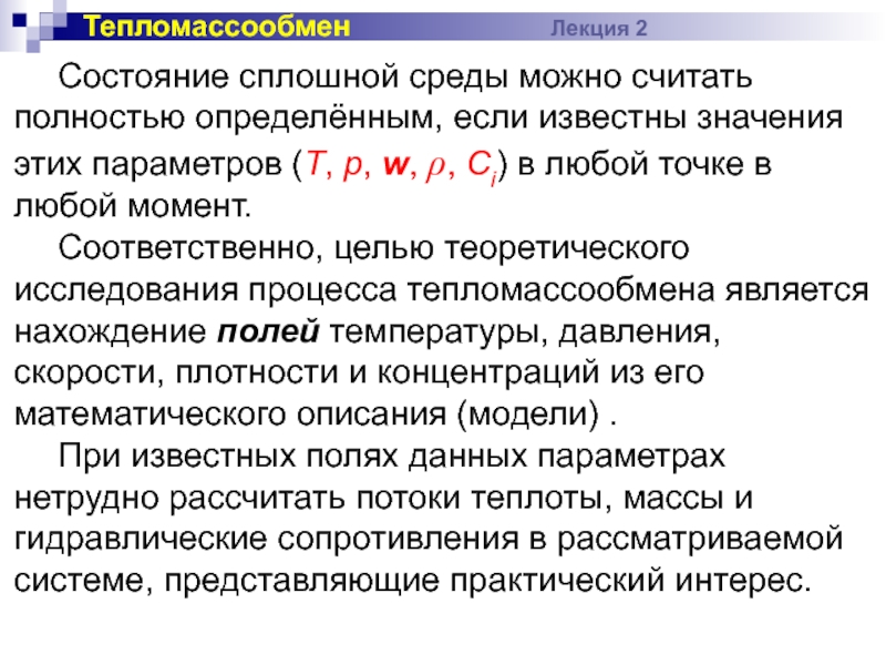 Соответственно, целью теоретического исследования процесса тепломассообмена является нахождение полей температуры, давления, скорости, плотности и концентраций из его математического описания (модели) .
