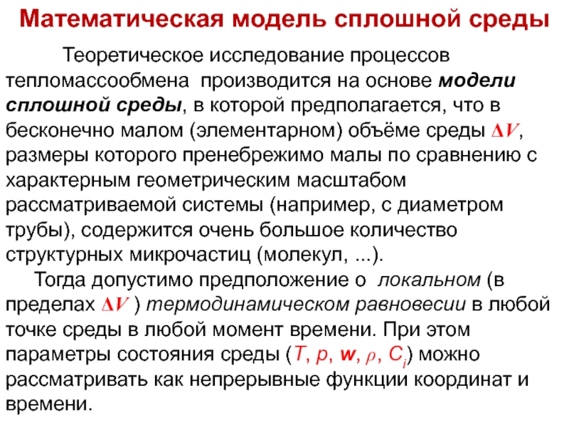 Тогда допустимо предположение о локальном (в пределах ΔV ) термодинамическом равновесии в любой точке среды в любой момент времени. При этом параметры состояния среды (Т, р, w, ρ, Сi) можно рассматривать как непрерывные функции координат и времени.