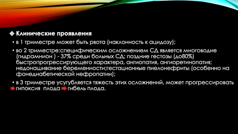 больных СД; поздние гестозы (до80%)быстропрогрессирующего характера, ангиопатия, ангиоретинопатия;недонашивание беременности;гестационные пиелонефриты (особенно на фонедиабетической нефропатии);
