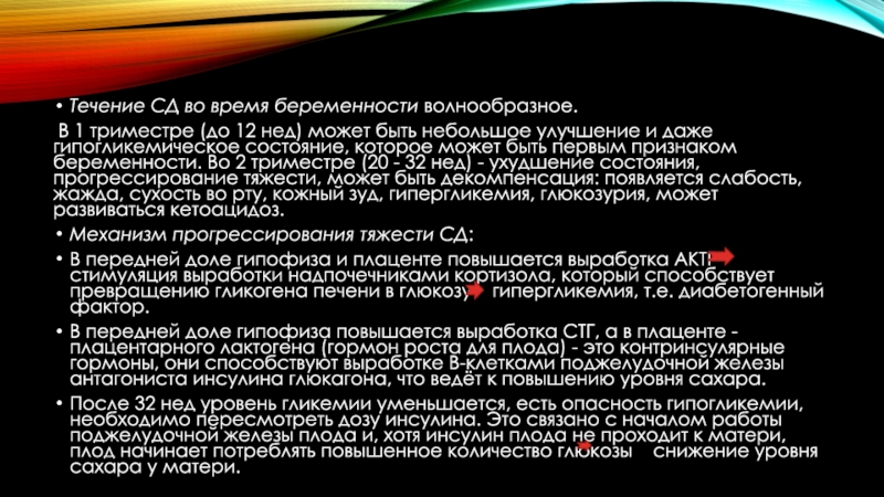После 32 нед уровень гликемии уменьшается, есть опасность гипогликемии, необходимо пересмотреть дозу инсулина. Это связано с началом работы поджелудочной железы плода и, хотя инсулин плода не проходит к матери, плод начинает потреблять повышенное количество глюкозы снижение уровня сахара у матери.