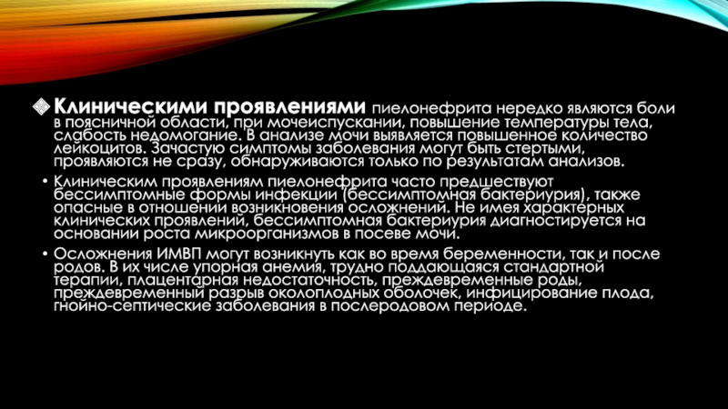 Осложнения ИМВП могут возникнуть как во время беременности, так и после родов. В их числе упорная анемия, трудно поддающаяся стандартной терапии, плацентарная недостаточность, преждевременные роды, преждевременный разрыв околоплодных оболочек, инфицирование плода, гнойно-септические заболевания в послеродовом периоде.
