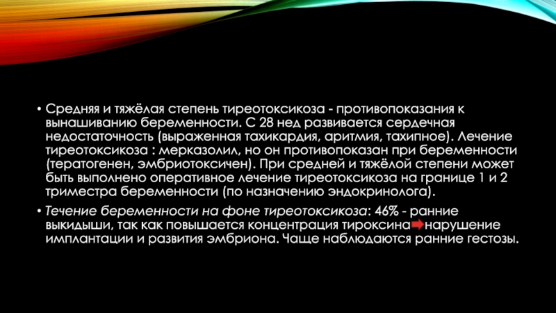 Слайд 16Средняя и тяжёлая степень тиреотоксикоза - противопоказания к вынашиванию беременности.
