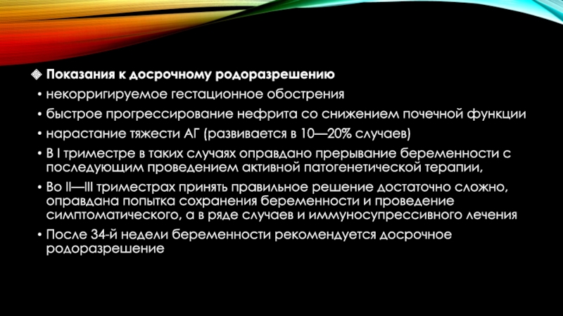 Во II—III триместрах принять правильное решение достаточно сложно, оправдана попытка сохранения беременности и проведение симптоматического, а в ряде случаев и иммуносупрессивного лечения